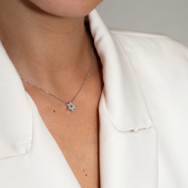שרשרת חמסה לבנה מכסף 925 על צוואר של דוגמנית