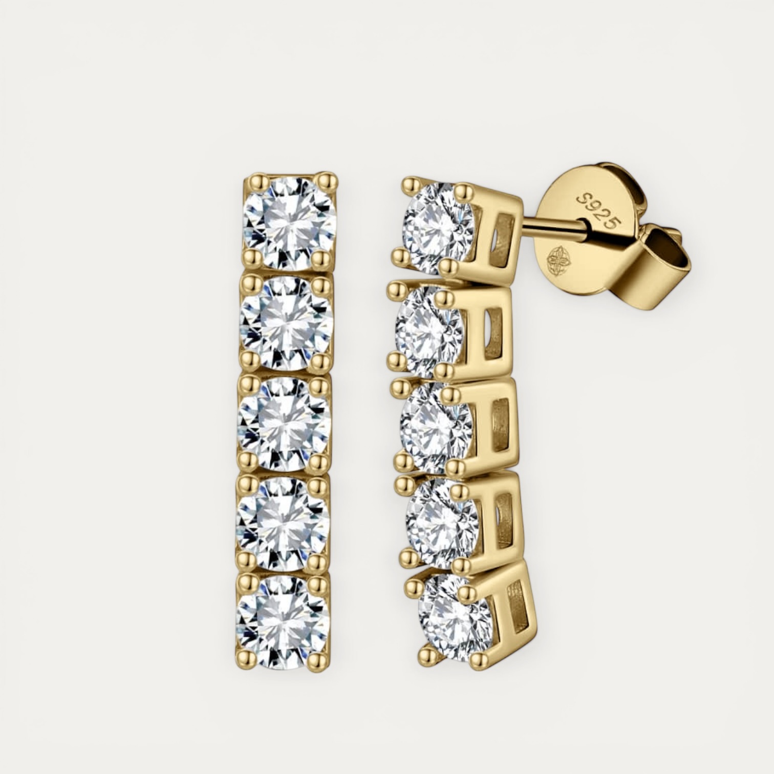 עגיל Rachel Gold בציפוי זהב 14 קארט עם חמישה שיבוצי מואסיניט עגולים. עיצוב עדין ונשי שמתאים למראה יומיומי וגם לערב אלגנטי.