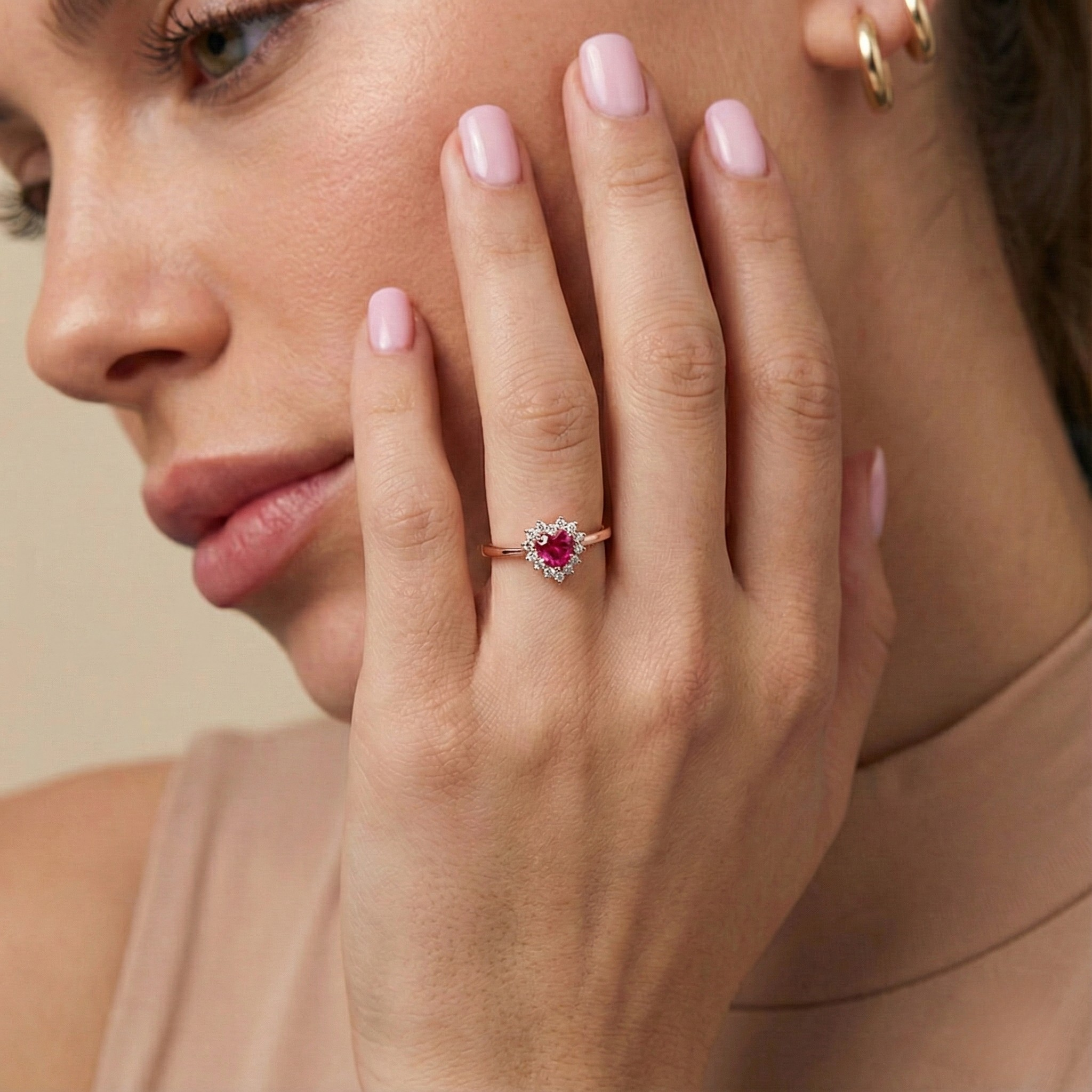 • אבנים: אבן לב מרכזית בצבע ורוד כהה (Dark Pink), מוקפת זרקונים שקופים.