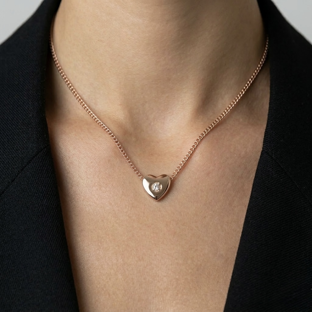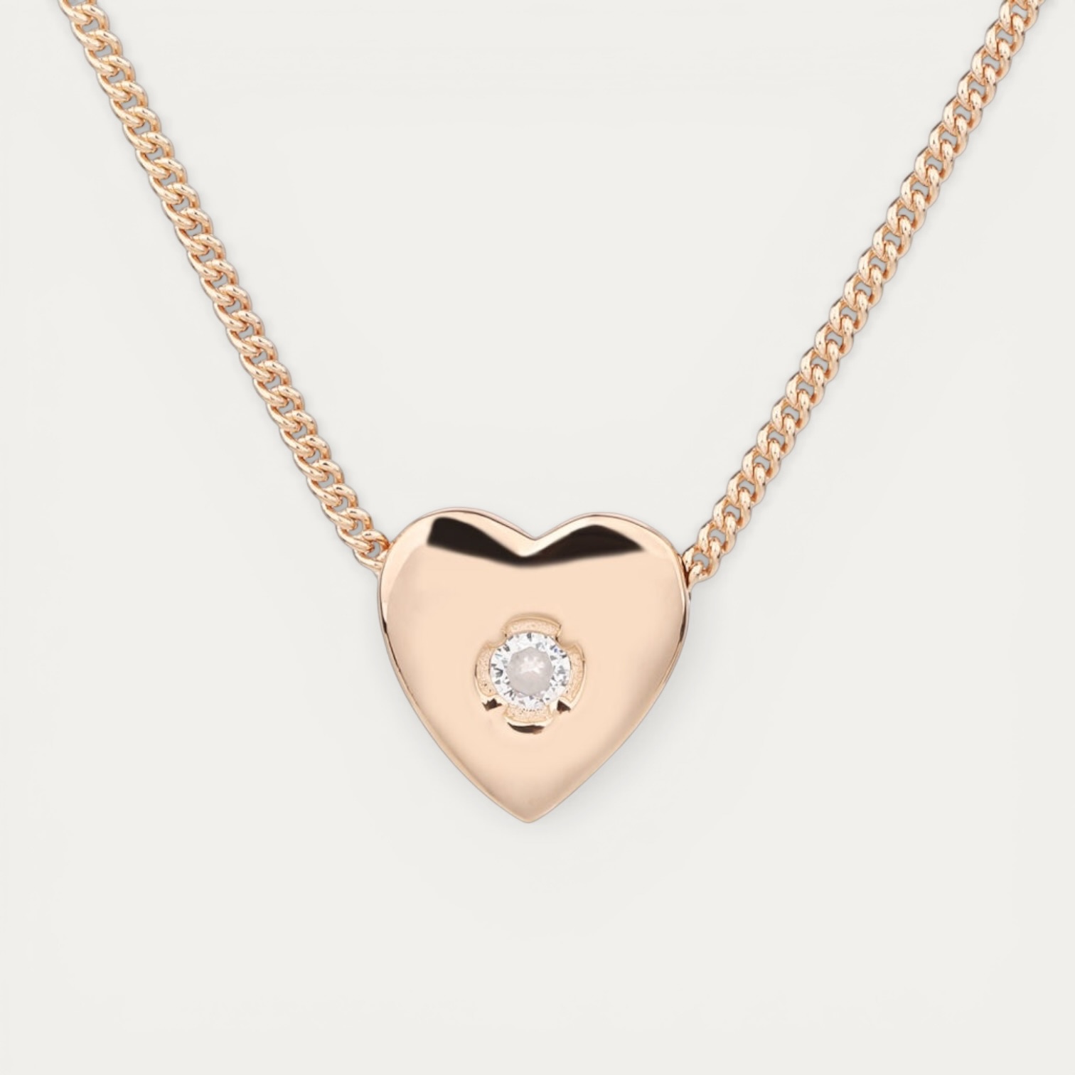 אהבה ממבט ראשון. דגם Classic Heart מציג שרשרת לב רוז גולד בעלת טקסטורה ייחודית. התליון המלא (11 מ"מ) הוא בעל גימור מוברש עדין (מט), ובמרכזו משובץ זרקון מבריק (3 מ"מ). השרשרת מגיעה באורך 37 ס"מ (+הארכה) ויושבת מושלם על הגוף.