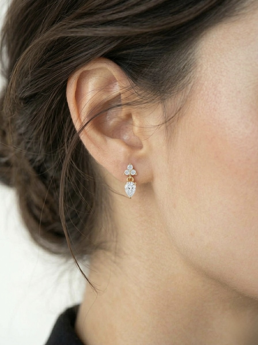 החלק הצמוד לאוזן מציג פרח קטן עם שלושה זרקונים איכותיים. בנוסף, אבן מרכזית בחיתוך טיפה (Pear) זזה בחופשיות מתחת לפרח. כתוצאה מכך, כל תנועת ראש גורמת לעגיל לנצנץ ולתפוס את האור בצורה מרהיבה.