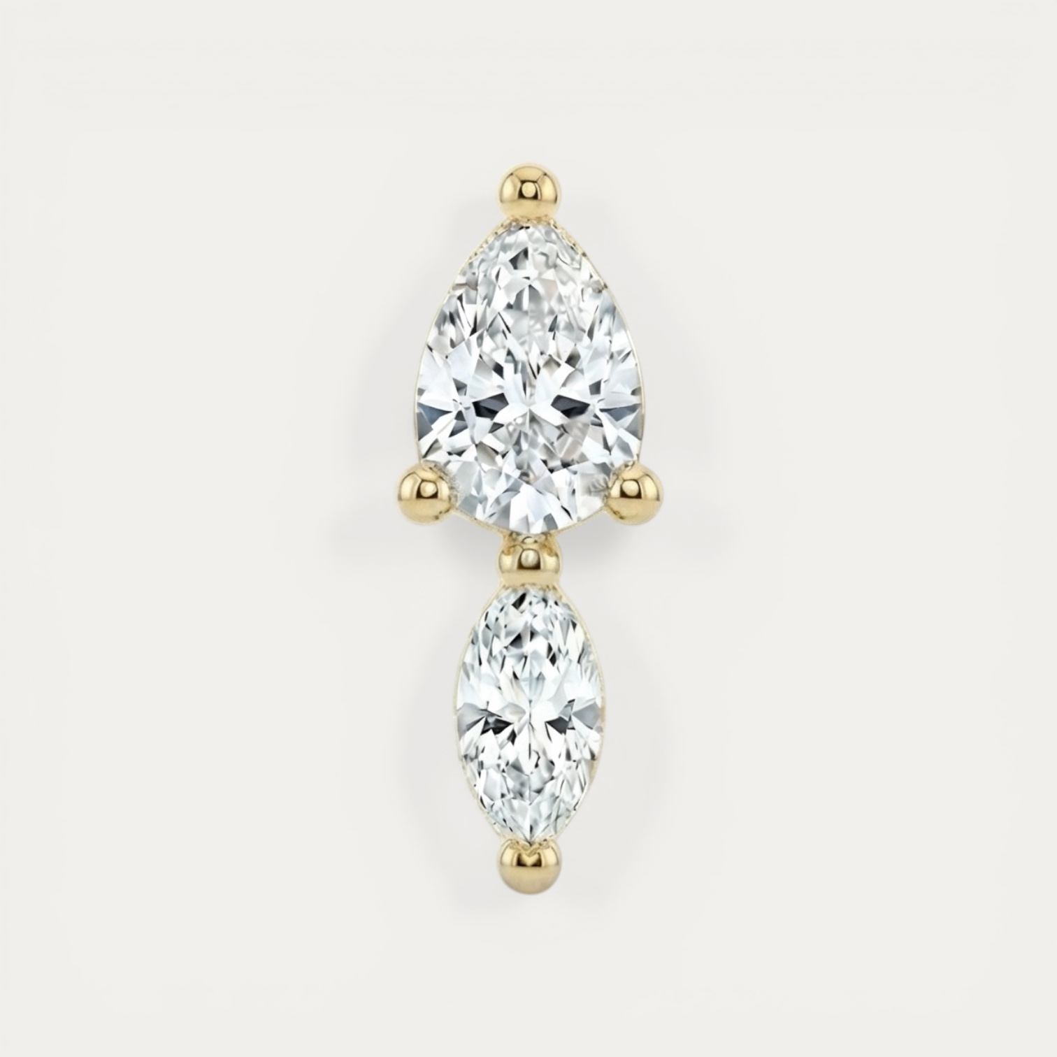 בחרנו לשלב שתי אבנים בחיתוכים גיאומטריים (טיפה ומרקיזה) בסידור אנכי. בנוסף, השילוב בין הזרקונים השקופים למסגרת הזהובה יוצר קונטרסט מרשים. כתוצאה מכך, העגילים לוכדים את האור מכל כיוון ומשדרים יוקרה של תכשיט זהב מלא.