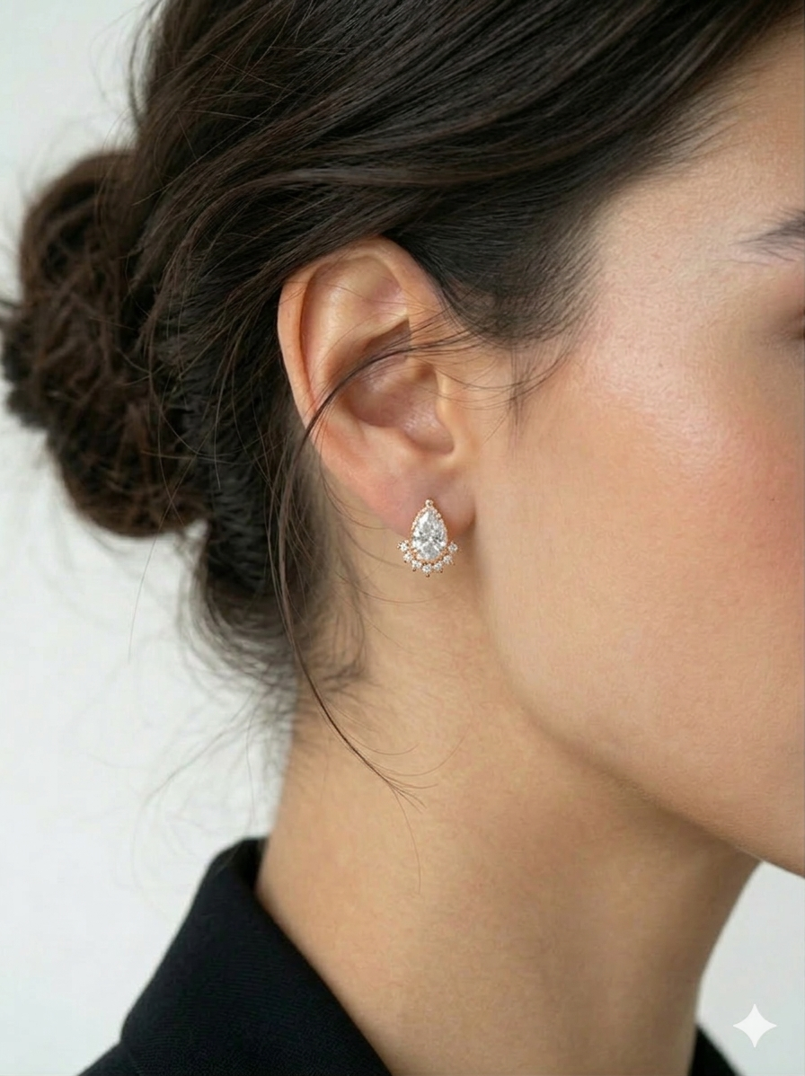 מרכז העגיל מציג אבן זירקון גדולה ואיכותית בחיתוך טיפה (Pear) בעלת ברק עוצמתי. בנוסף, הקפנו את בסיס האבן בעיטור של זרקונים קטנים המזכירים צורת כתר יוקרתית. כתוצאה מכך, התכשיט לוכד את האור מכל כיוון ויוצר מראה עשיר ומנצנץ.
