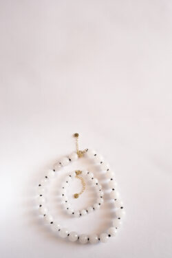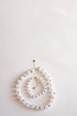 מחרוזת Jude משלבת יופי טבעי עם נגיעה אלגנטית. עשויה מאבני Jade לבנות בגוון חלבי עם ורידים עדינים, באורך 35 ס"מ + הארכה, וסוגר כסף 925 בציפוי זהב 14 קארט.