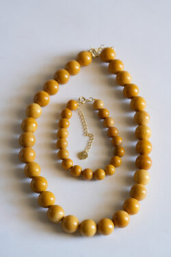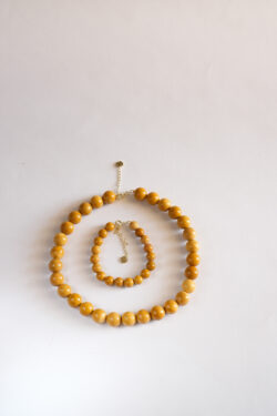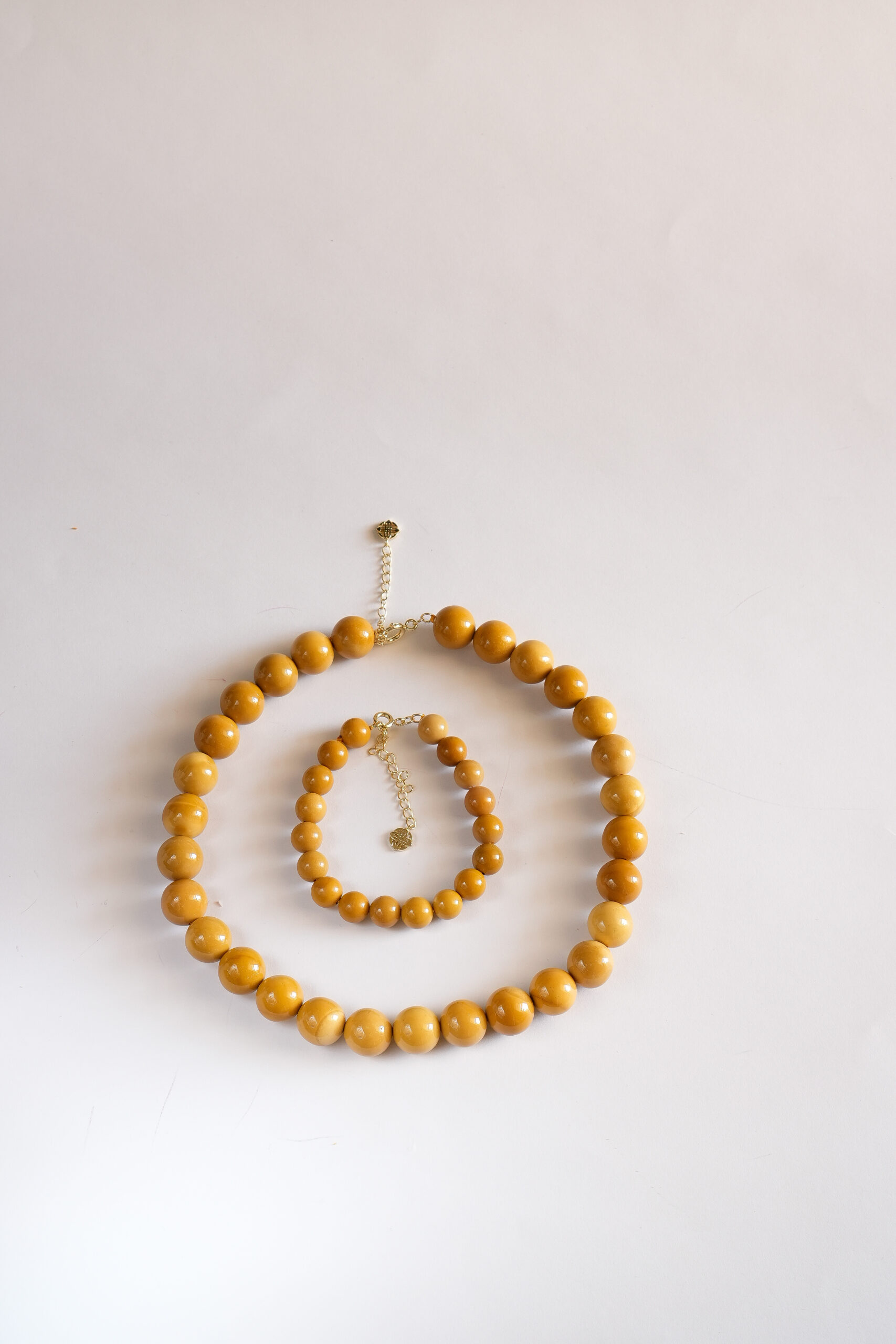 שרשרת Mokit עשויה מאבני Mookaite טבעיות בגוון צהוב חמים, עם סוגר כסף 925 בציפוי זהב 14 קראט. תכשיט ייחודי עם נוכחות טבעית ומלאת אופי.