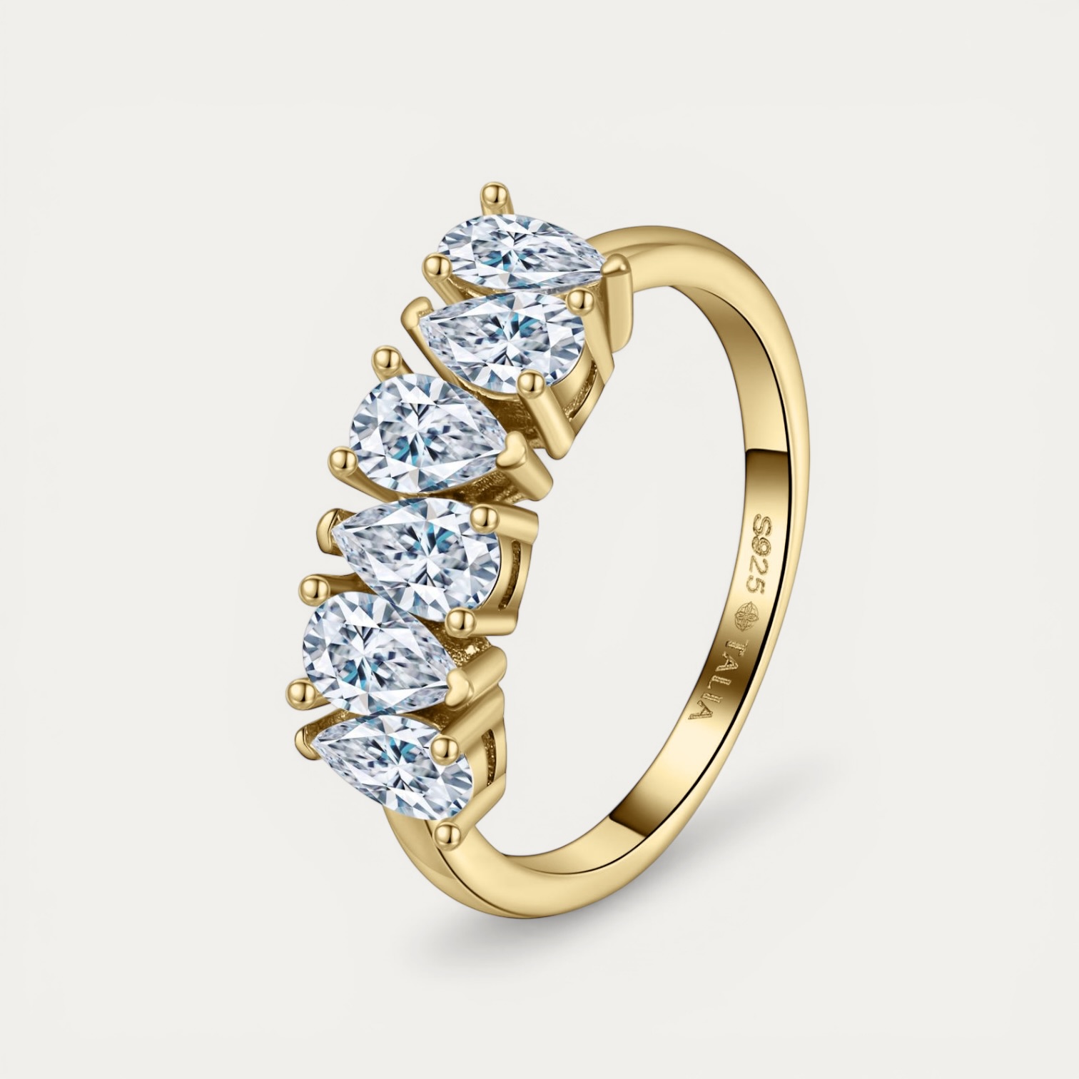 טבעת Pears gold בציפוי זהב 14 קארט עם שש אבני מואסיניט בצורת טיפה. טבעת נשית, מרשימה ועדינה – מושלמת ללוק אלגנטי.