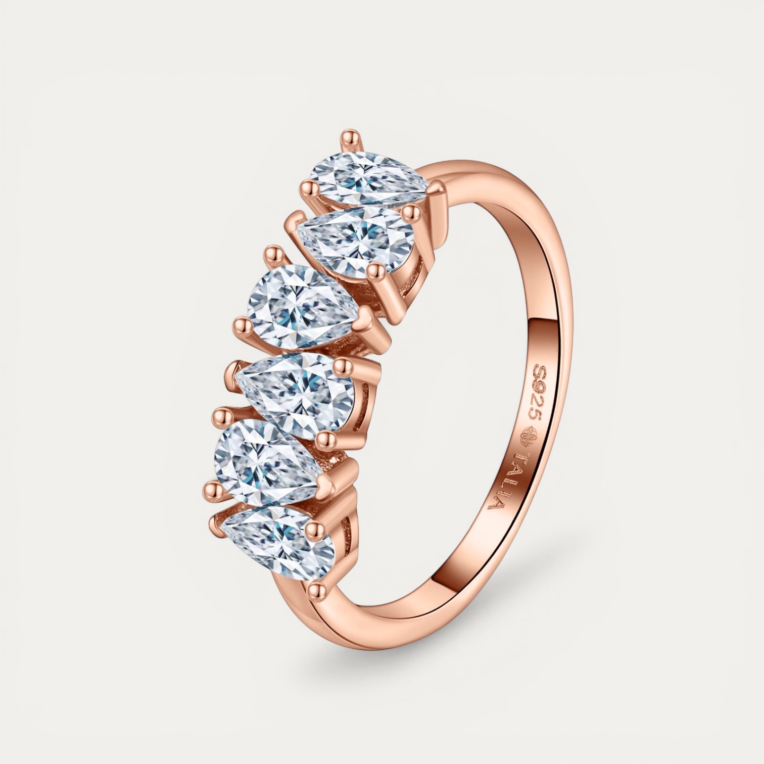 הטבעת עשויה כסף סטרלינג 925 בציפוי רוז גולד איכותי בעובי 2 מיקרון. היא משובצת 6 אבני מואסיניט בצורת טיפה, כל אחת בגודל 3×5 מ״מ ובמשקל 0.25 קראט. האבנים בדרגת צבע D וברמת ניקיון VVS1 – תכונות שמעניקות להן ברק גבוה ומראה נקי במיוחד.
