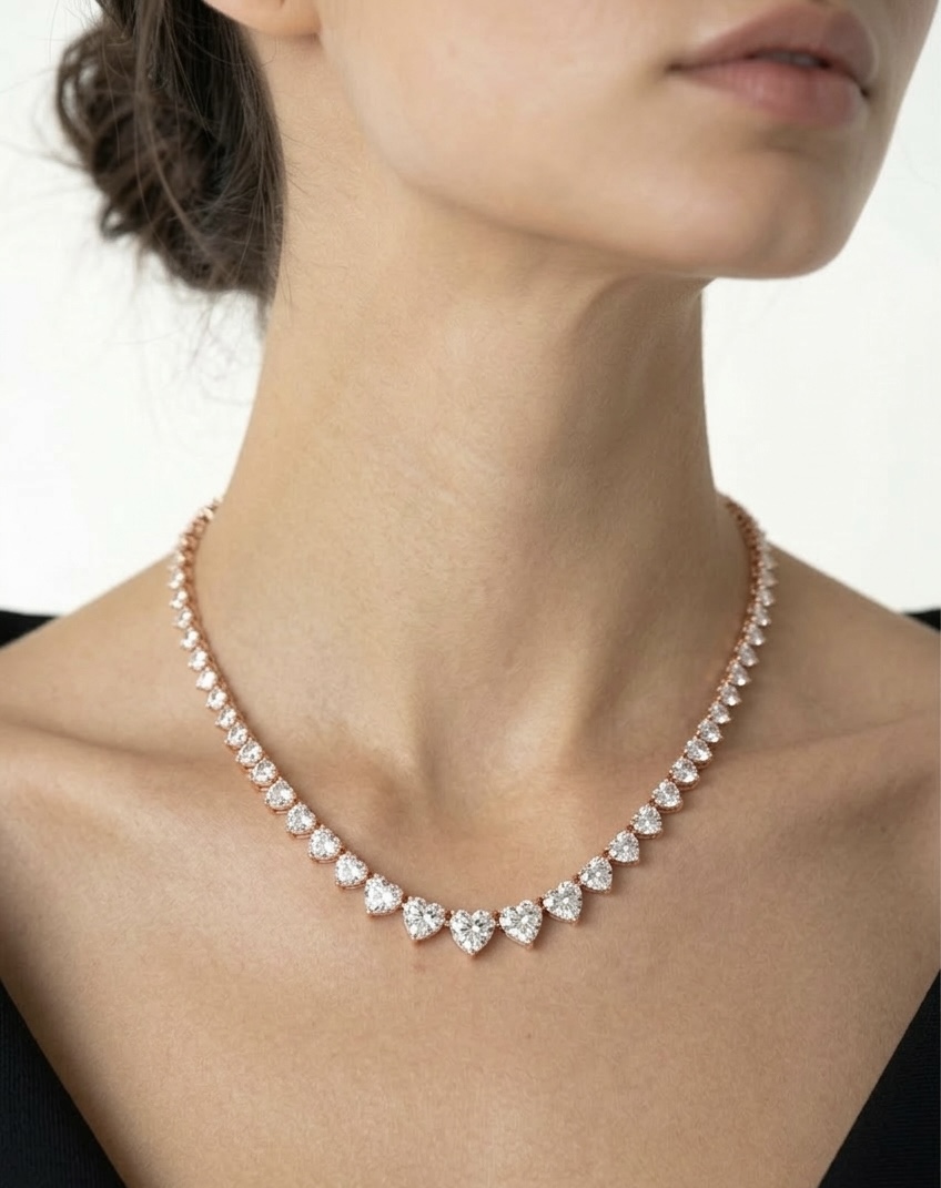 עיצוב מדורג וחיתוך לב ראשית, שילבנו בשרשרת זרקונים (Cubic Zirconia) בחיתוך לב מדויק. כמו כן, סידרנו את האבנים במבנה מדורג חכם. האבנים מתחילות בגודל 3 מ"מ בצדדים, גדלות ל-4 מ"מ, ומגיעות ל-5 מ"מ במרכז. בגלל שהשינוי הדרגתי, השרשרת מנחה את העין אל מרכז המחשוף. כלומר, היא יוצרת אפקט מחמיא ומאריך.