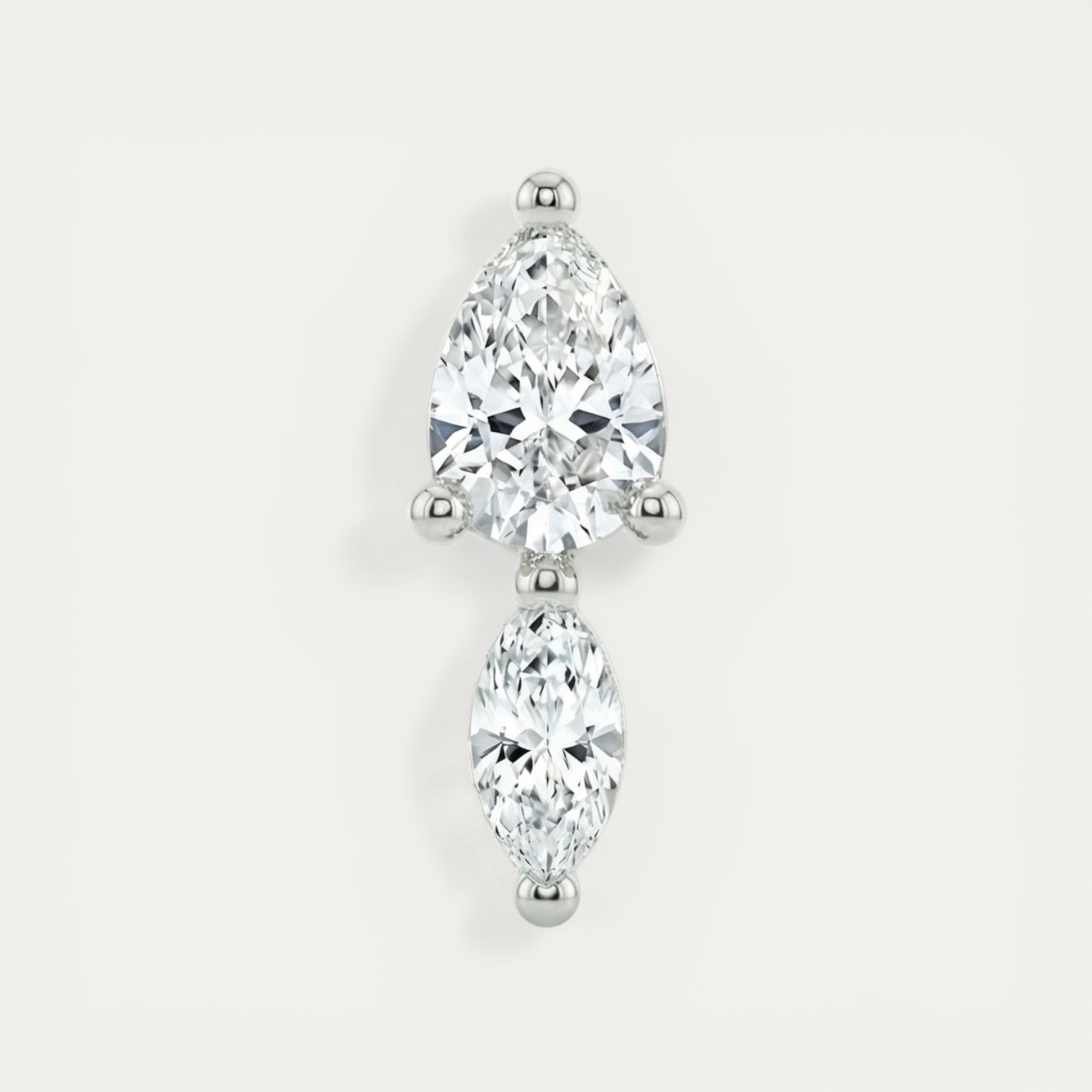 בחרנו לשלב שתי אבנים בחיתוכים שונים (טיפה ומרקיזה) זו מעל זו. בנוסף, הקפדנו על שיבוץ מינימליסטי שנותן לאבנים את כל הפוקוס. כתוצאה מכך, האור נשבר על העגיל בצורה מרהיבה והוא נראה כמו תכשיט יהלומים יוקרתי.