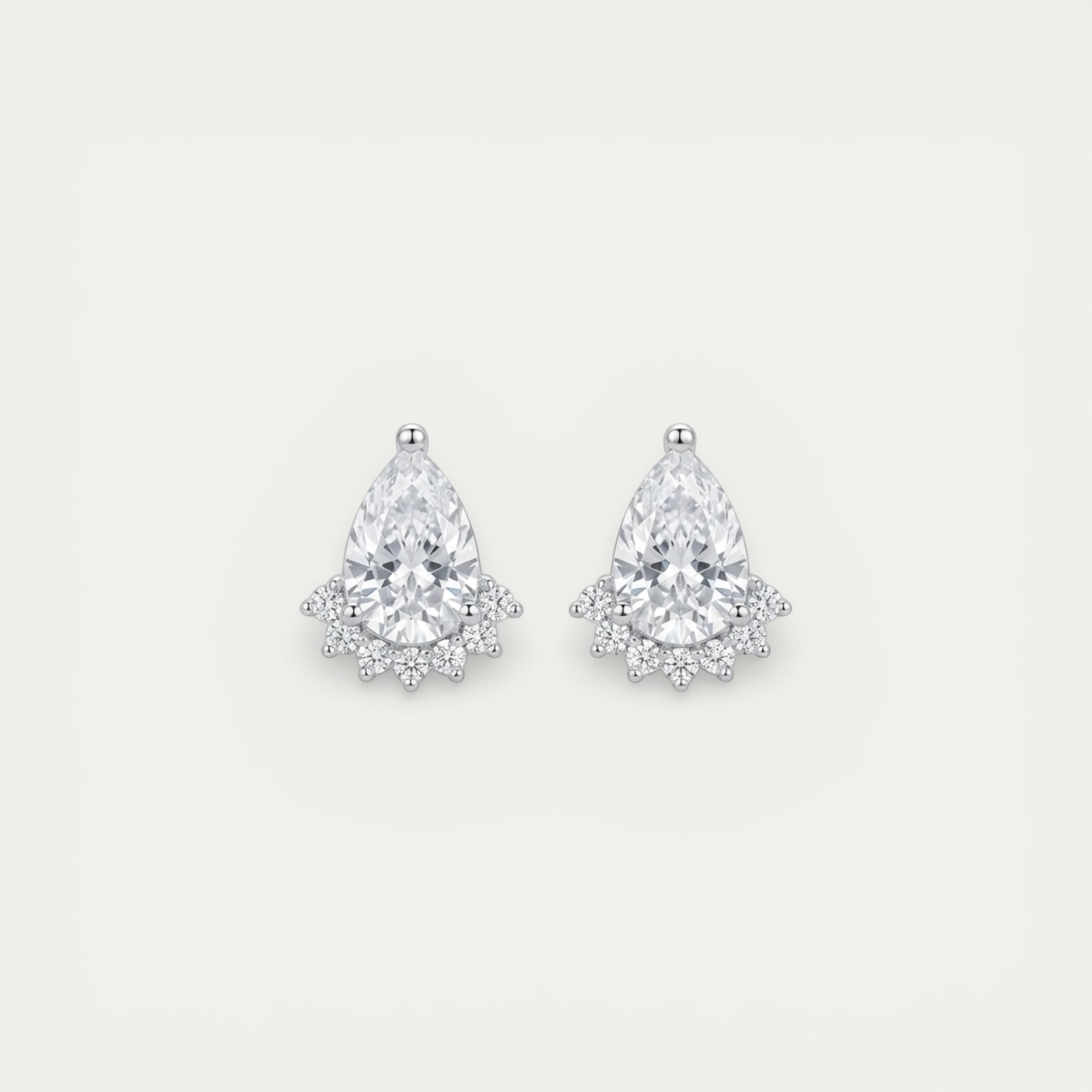 מרכז העגיל מציג אבן זירקון גדולה בחיתוך טיפה (Pear) בעלת נצנוץ עוצמתי. בנוסף, הקפנו את בסיס האבן בחצי עיגול של זרקונים קטנים המזכירים צורת כתר. כתוצאה מכך, התכשיט לוכד את האור מכל זווית ויוצר מראה עשיר ומורכב.