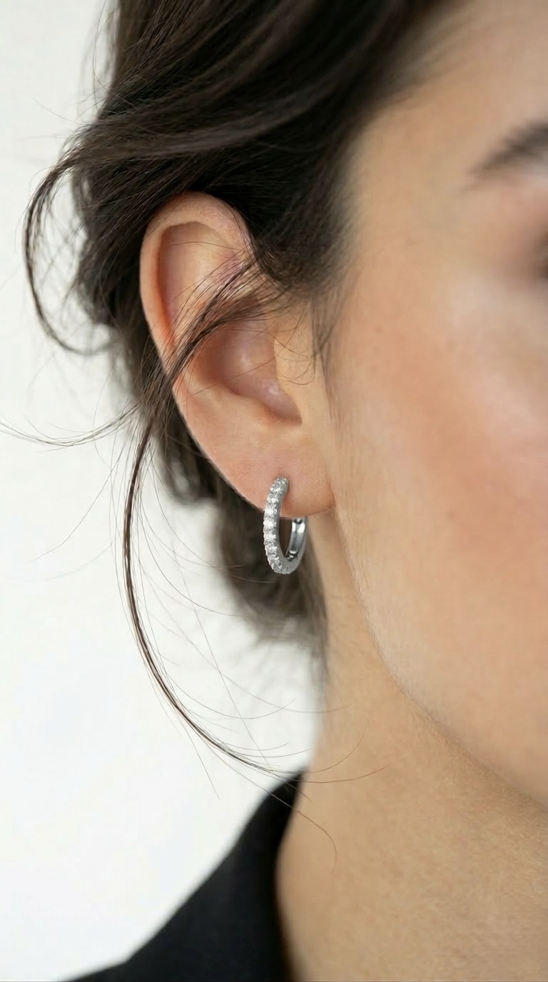 בחרנו בעיצוב מינימליסטי של חישוק עגול. בנוסף, שיבצנו את החלק הקדמי בשורה צפופה של זרקונים שקופים (Pavé). כתוצאה מכך, התכשיט מחזיר אור בצורה מקסימלית ומתאים במיוחד לנשים שאוהבות את המראה הלבן והנקי ("Clean Girl Aesthetic").