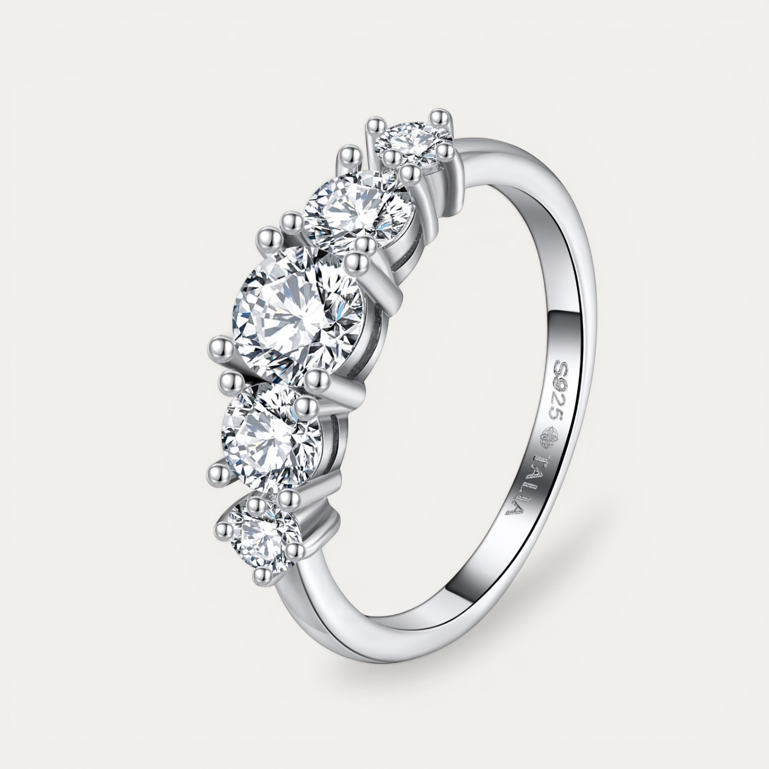 טבעת כסף 925 עם חמש אבני מואסיניט נוצצות. עיצוב קלאסי ומדויק שמשלב עדינות, יוקרה וברק מושלם לכל מראה.