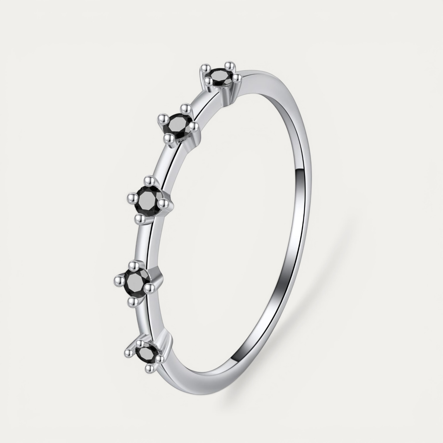 טבעת כסף 925 עם אבני מואסיניט שחורים משלבת עוצמה ואלגנטיות. היא מאירה כל מראה בניצוץ עמוק ומדויק. חמש האבנים העגולות בגודל 1 מ"מ מוסיפות עומק וברק יוצא דופן. כל אבן מוסיפה זוהר טבעי ותחושת יוקרה.