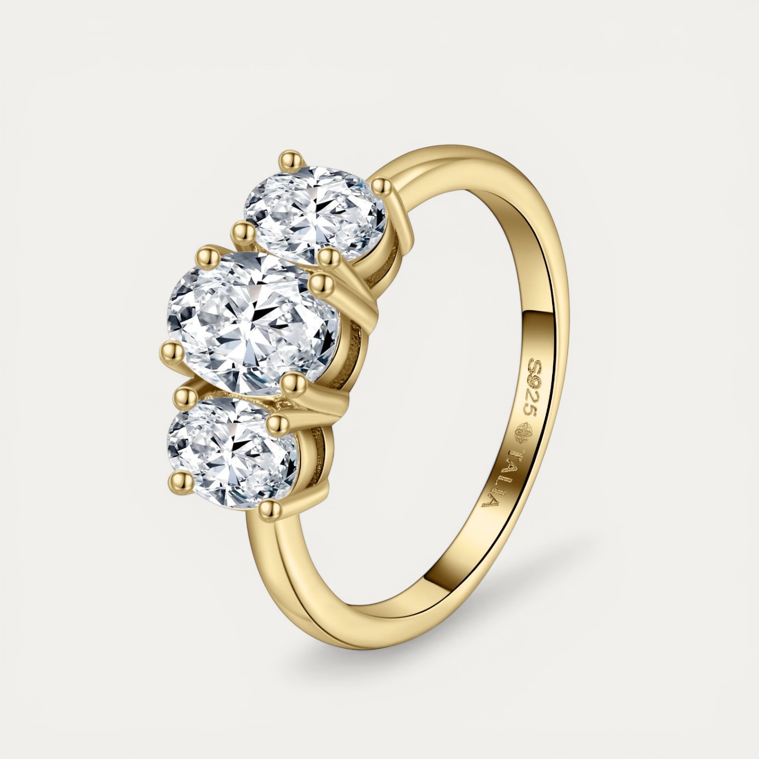 עיצוב נשי ואלגנטי. אנו יוצרים את טבעת Trio Gold מכסף 925 בציפוי זהב עבה (2 מיקרון). התכשיט בולט בזכות שלוש אבני מואסיניט (מרכזית בחיתוך אובלי 1 קראט). טבעת עוצמתית שנותנת אור רב לכל הופעה.